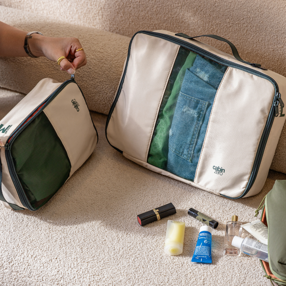 Lux packing cube set in Cebu Sands combines style and structure. With durable materials, mesh windows, and self-standing design, packing has never been easier. Made from 100% recycled nylon with water repellency.