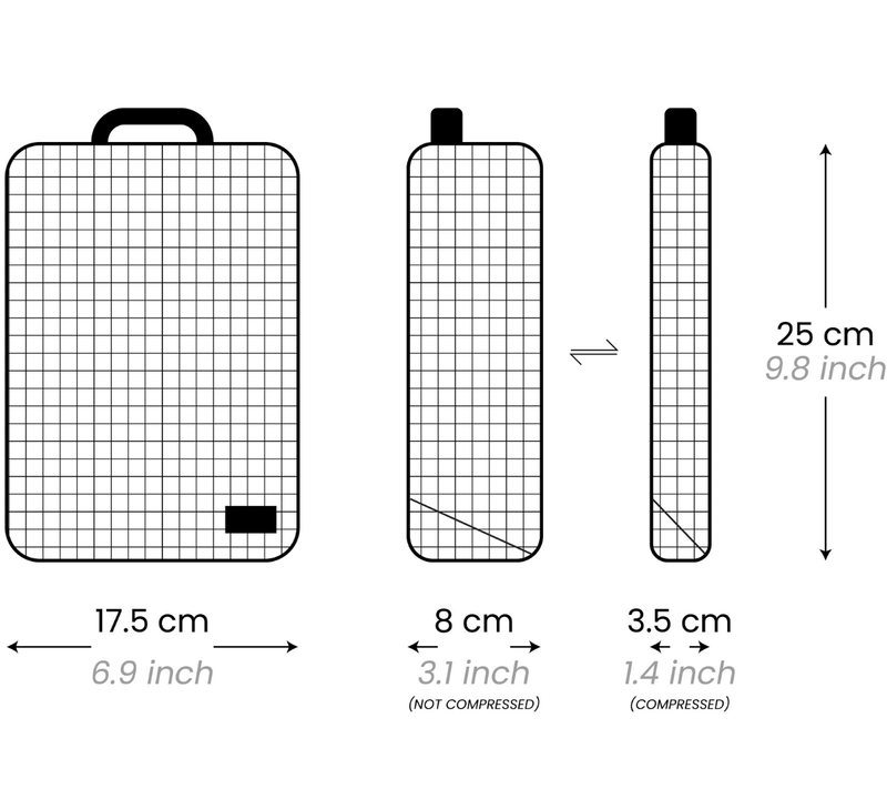 Compressed: 25 x 17.5 x 3.5 cm / 9.8 x 6.9 x 1.4 in
